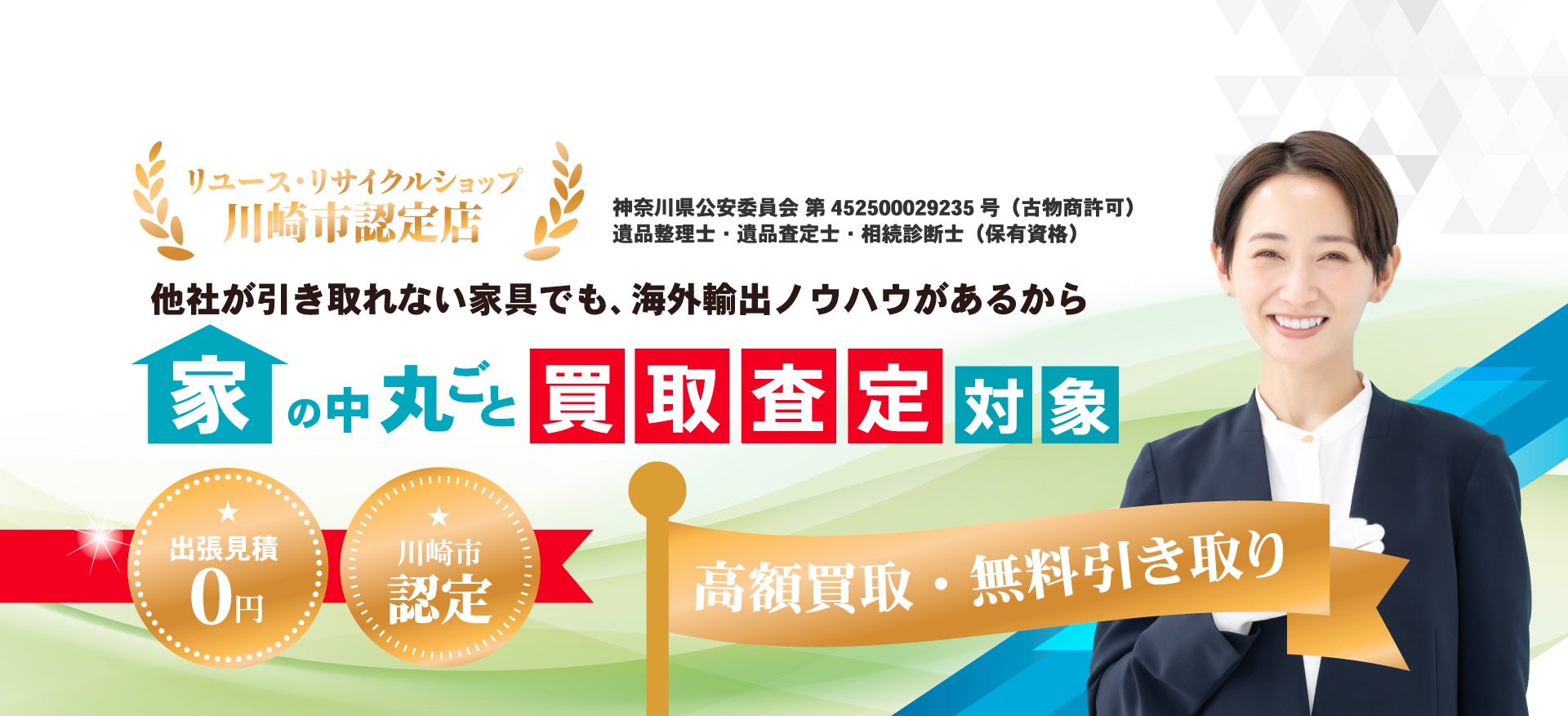 SSRは、川崎・横浜を中心に一都三県でサービスを展開する遺品整理・生前整理に強い出張買取専門店です。川崎市の「リユース・リサイクルショップ」認定を取得しており、川崎市と連携して出張買取を行っております。
